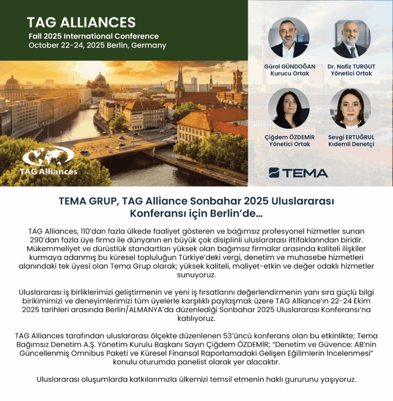 TAG Alliances tarafından uluslararası ölçekte düzenlenen 53’üncü konferans olan bu etkinlikte; Tema Bağımsız Denetim A.Ş. Yönetim Kurulu Başkanı Sayın Çiğdem ÖZDEMİR; “Denetim ve Güvence: AB’nin Güncellenmiş Omnibus Paketi ve Küresel Finansal Raporlamadaki Gelişen Eğilimlerin İncelenmesi” konulu oturumda panelist olarak yer alacaktır.